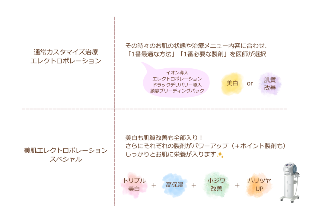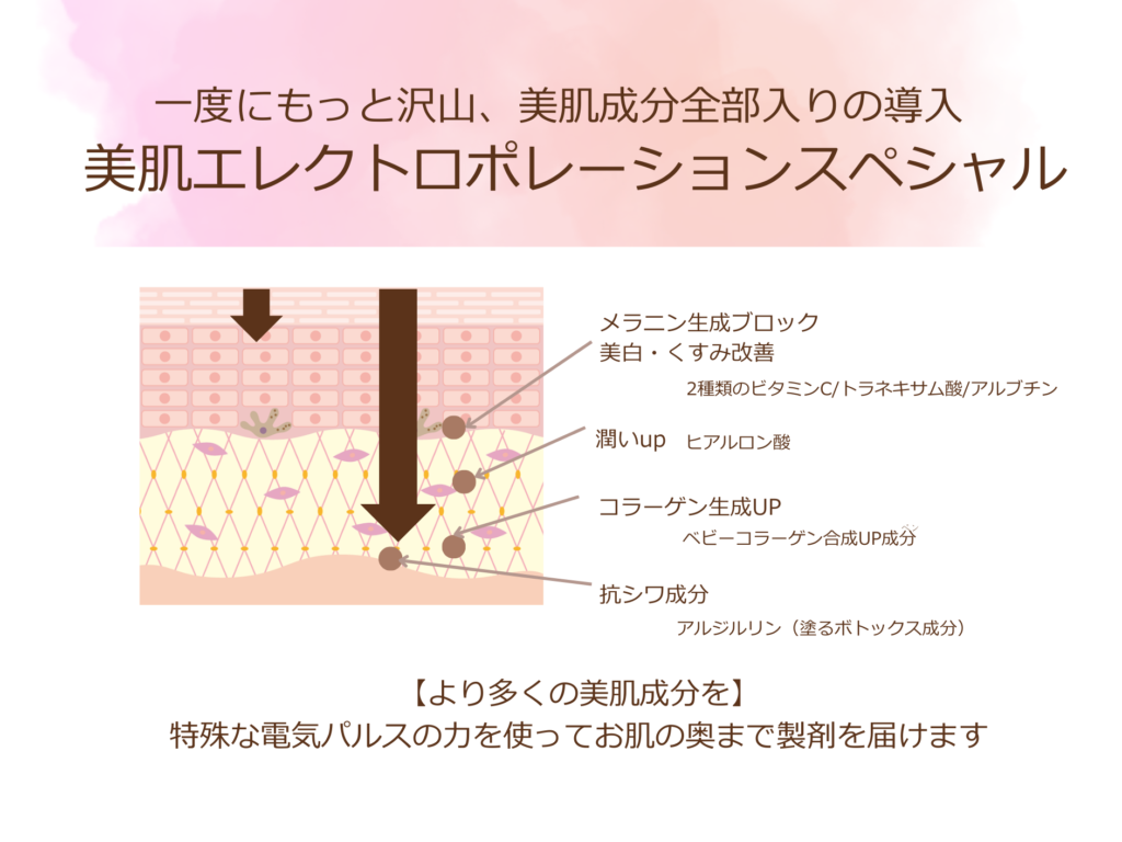 この度の「美肌エレクトロポレーションスペシャル」では、その日のメニューに合わせた・・だけでなく、+αで、抗酸化、トリプル美白、抗シワ、コラーゲンup成分が1回に全て入った「一度に贅沢に全部入り♪」の栄養をお肌に入れることが出来るのが特徴です。。