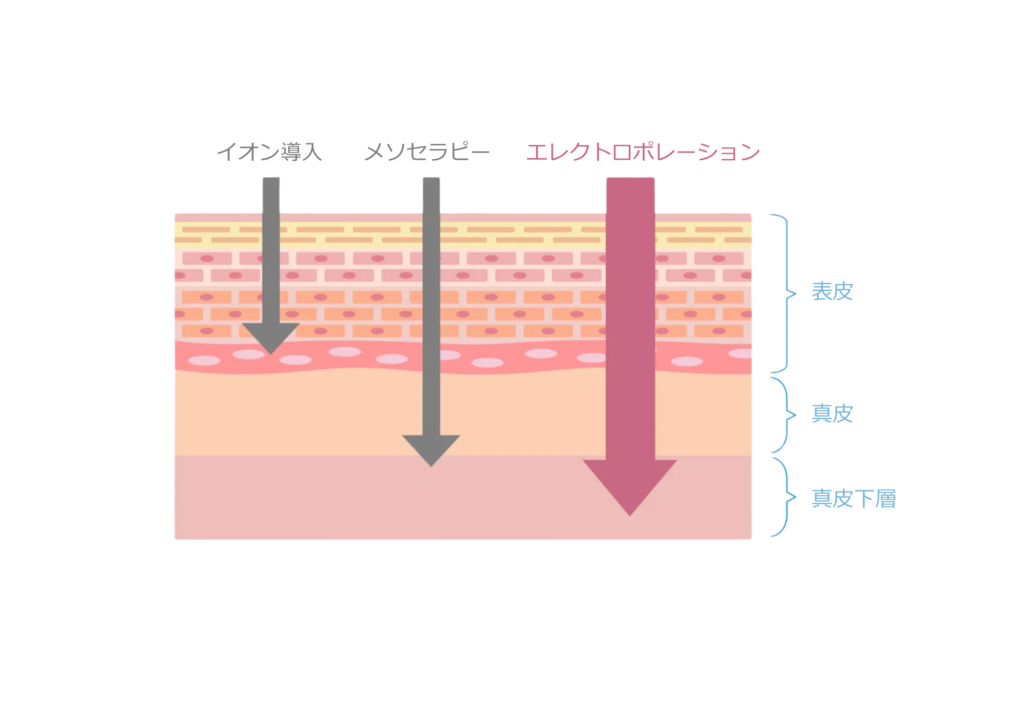 エレクトロポレーションでは、特殊な電気パルスをかけるため、イオン導入では導入が難しかった高分子までを導入することができ、お肌の深い「真皮」まで製剤を届けることが可能です。(電気の刺激が、イオン導入より強いため、デリケートなお肌状態では、アルジネートマスク付イオン導入をおすすめする場合がございます。当日ご相談ください)