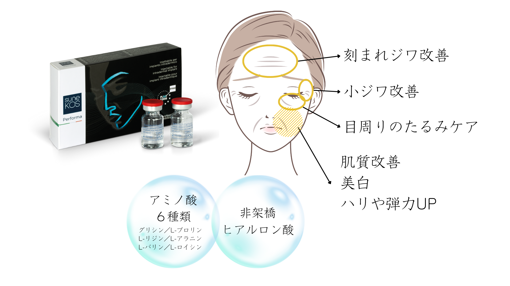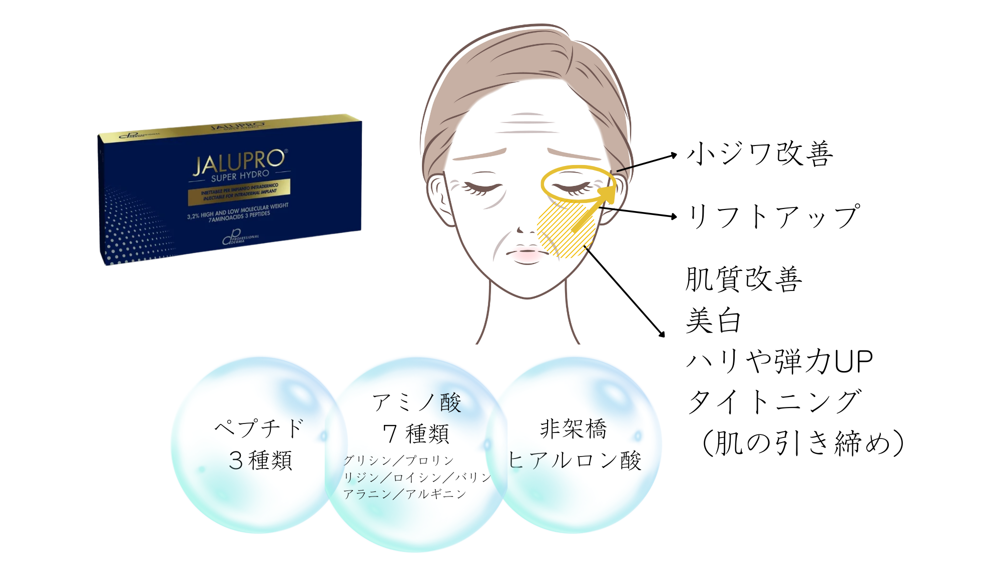 拡散が早いので、目回りや額などの皮膚の薄い部位にも馴染みが良く、ピンポイントで細かく注射することで刻まれジワも改善されます。