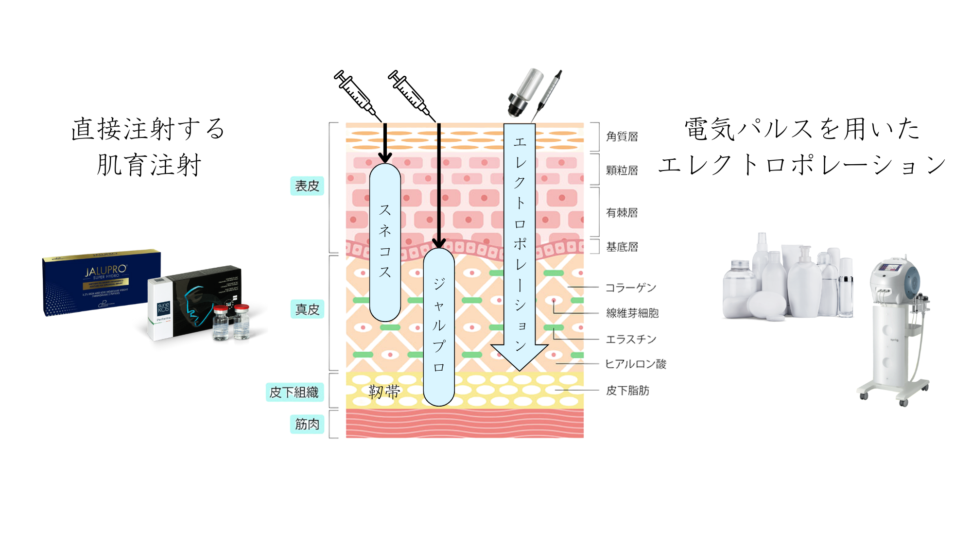 お肌に栄養を届ける治療は「薬剤を直接注射で注入する肌育注射」と、「特殊パルス電流を用いるエレクトロポレーション」がございます。