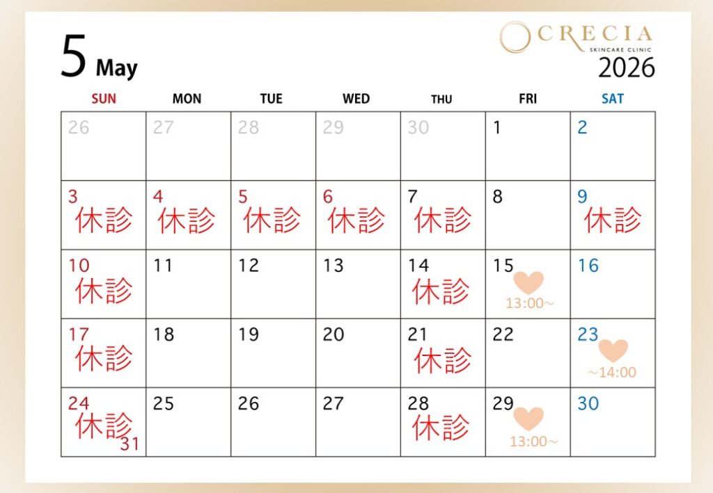 5月15日、29日は13時~、23日午前は院長不在のため、