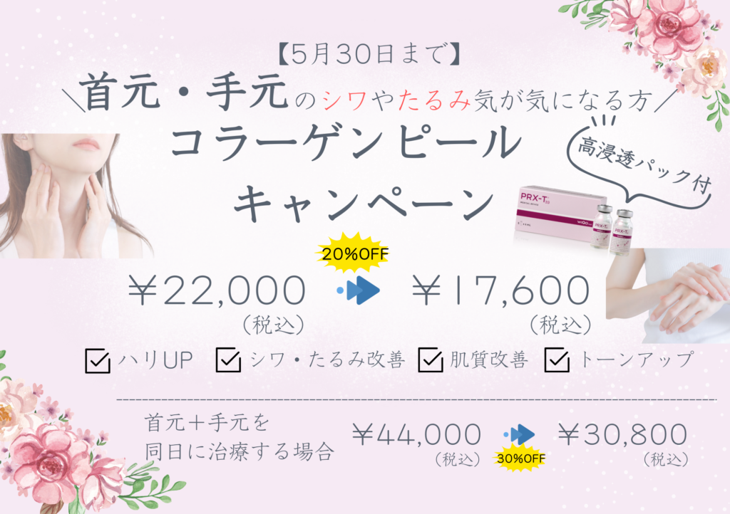 コラーゲンピールは、首元or手元どちらかの場合が通常価格の20%引き、首元+手元を同時に治療する場合は、30%引きとなります。